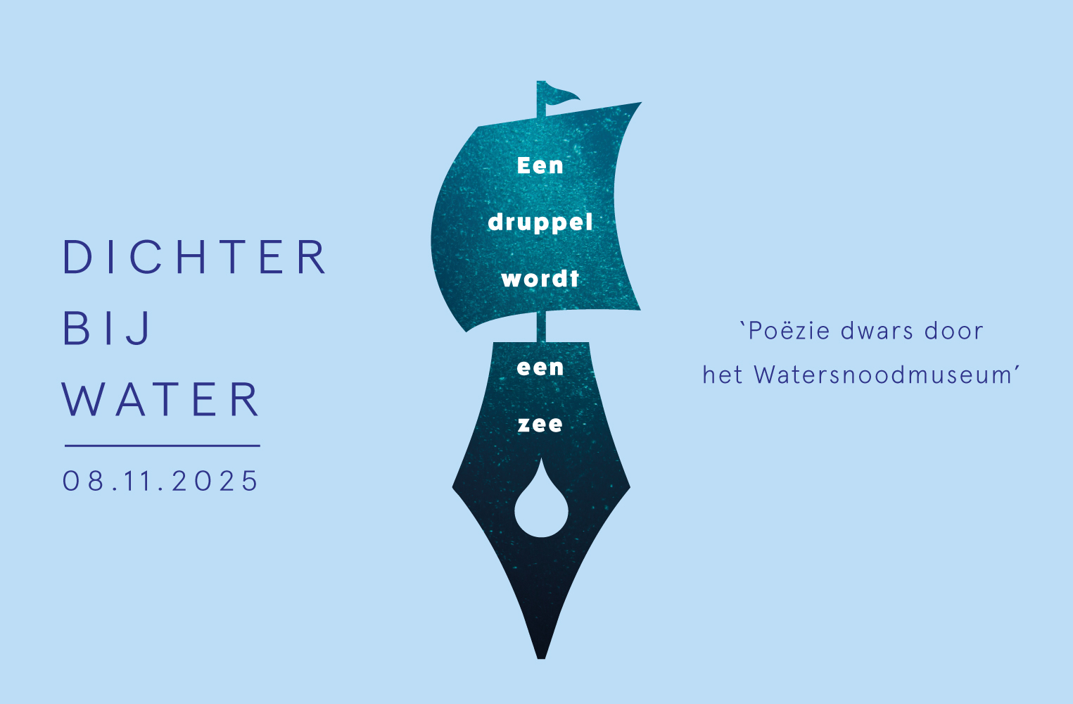Op zaterdag 8 november vindt de derde editie van Dichter bij Water plaats in het Watersnoodmuseum. Tijdens het festival met als thema; ‘Een druppel wordt een zee’, kun je door het hele museum poëzie beleven. Van gedichten tussen museumobjecten tot poëziefilms en van letterzetten tot installaties. Tijdens het publieksprogramma dragen verschillende dichters hun werk voor, is er een bijdrage van Arita Baaijens, muziek van Matta Klap, en geven we samen taal water.